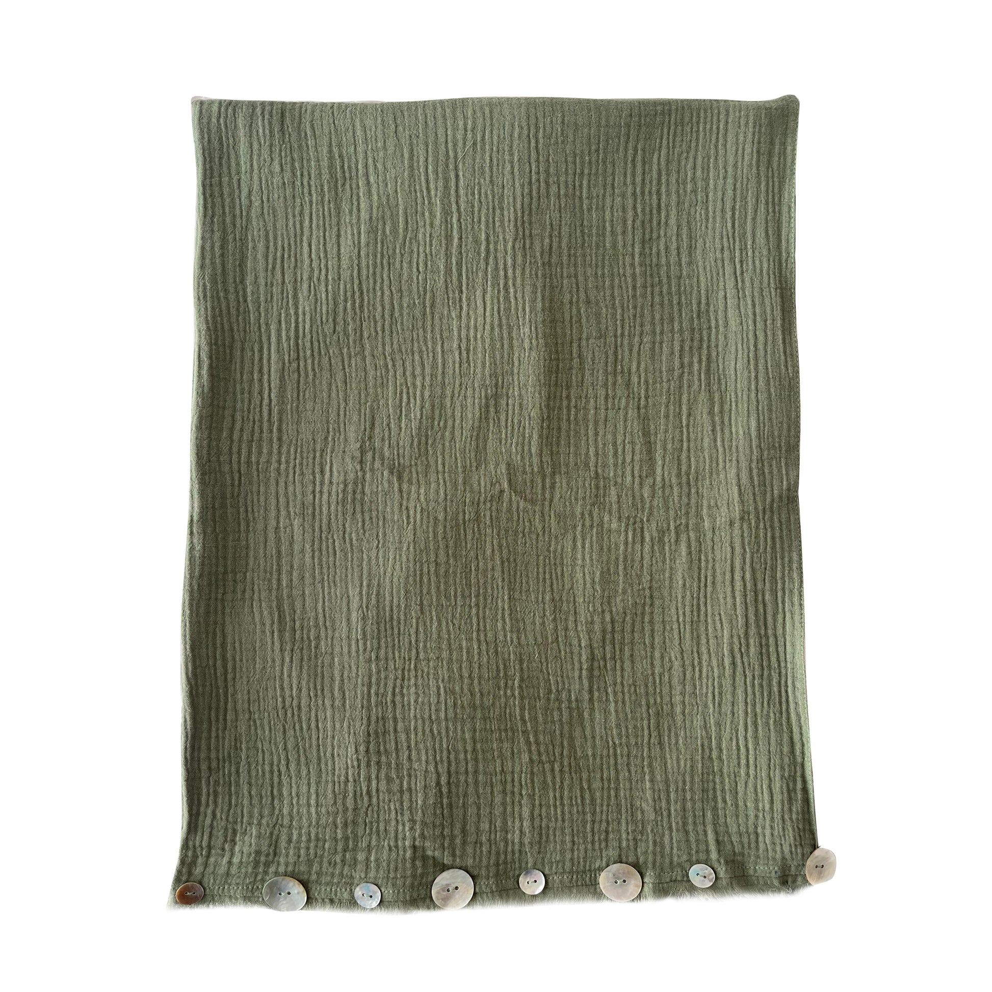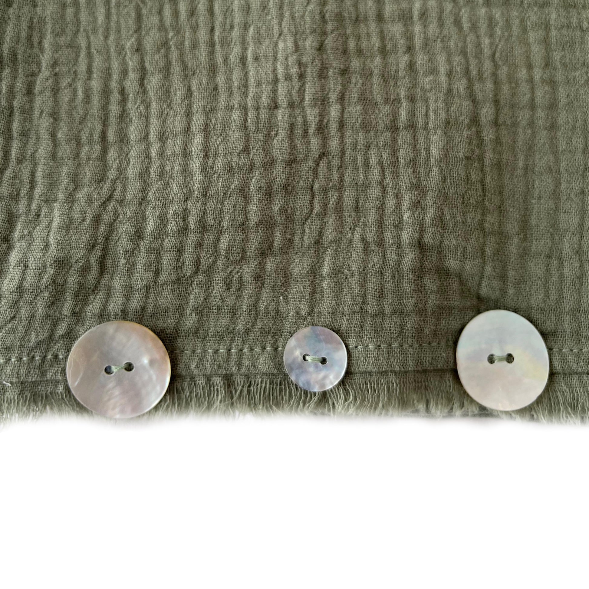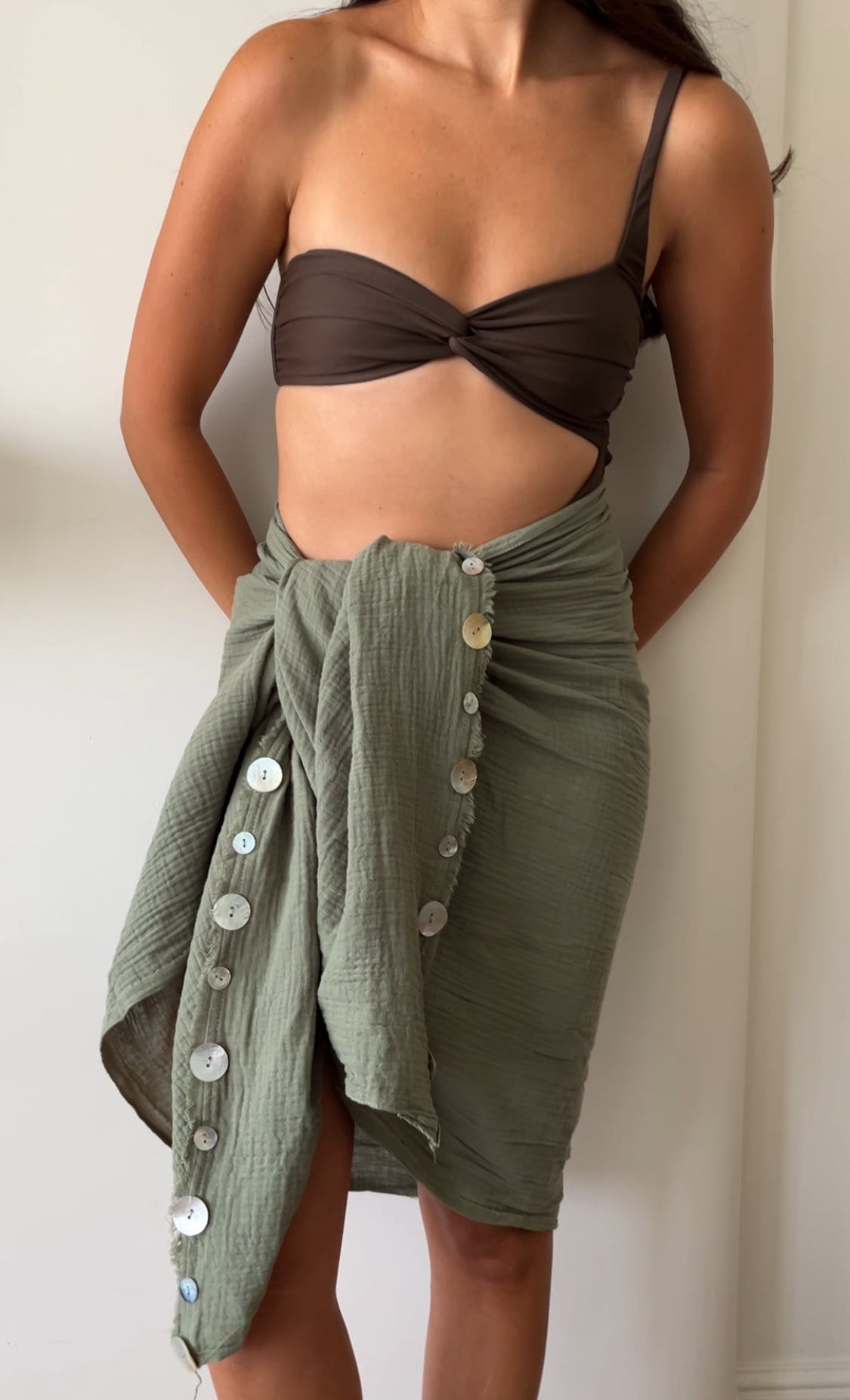 The perfect linen pareo to cover up your eenie-meenie-polka-dot bikini, lined with mother-of-pearl buttons, in colorway 'Jungle'.