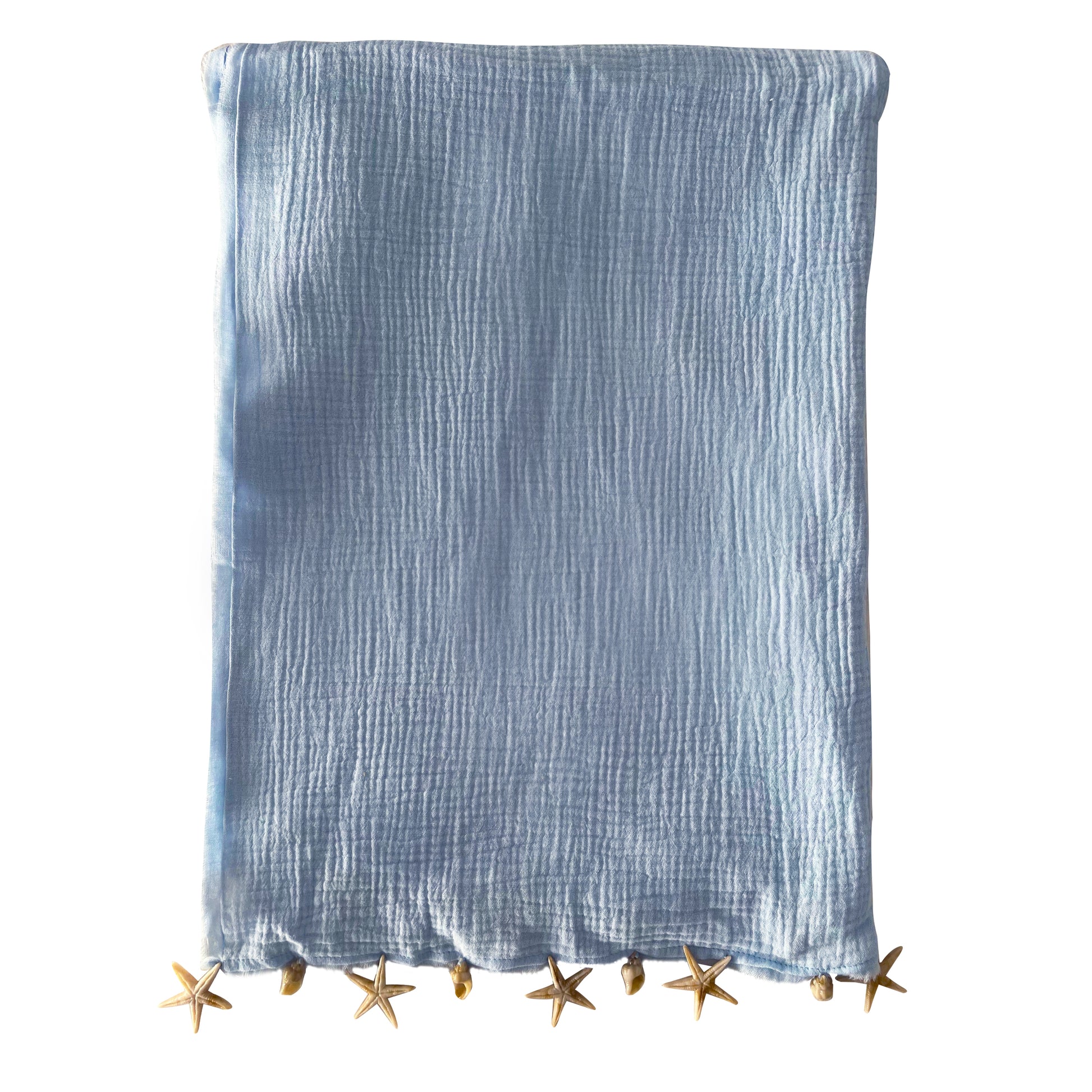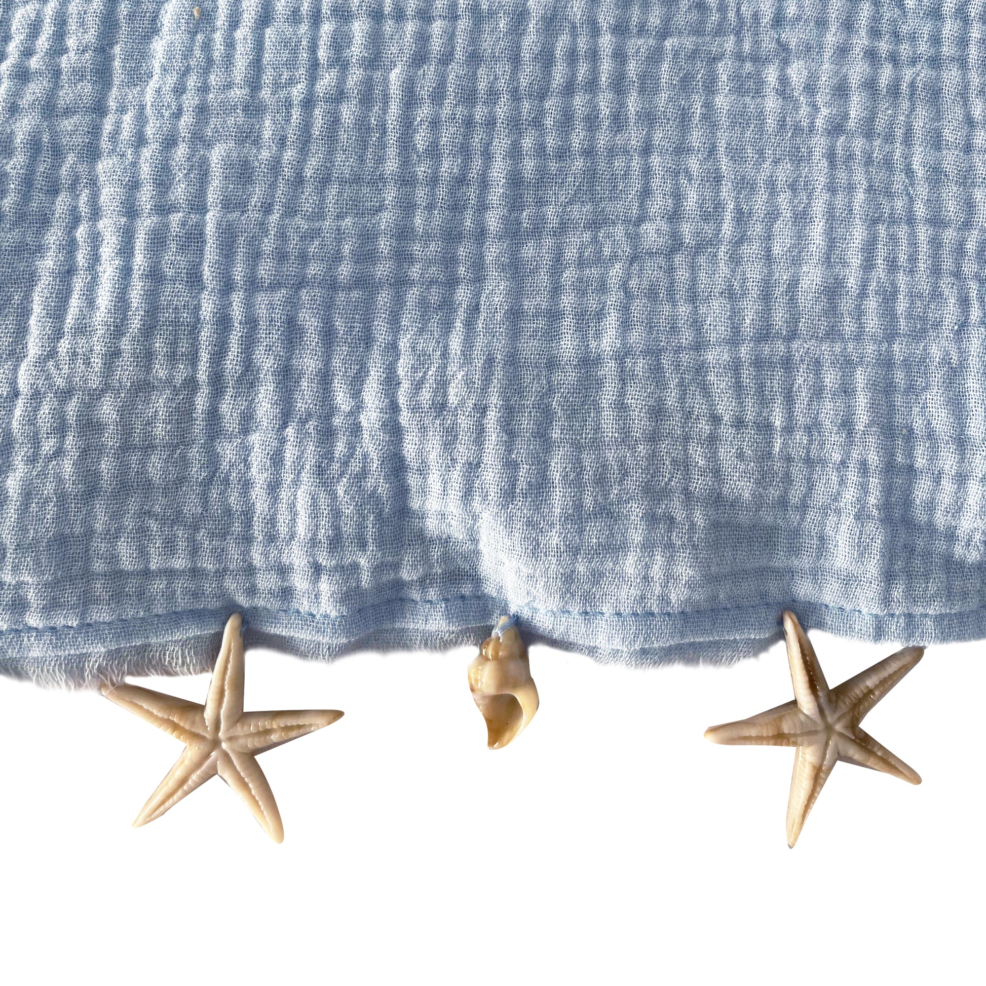 The perfect linen pareo to cover up your eenie-meenie-polka-dot bikini, lined with starfish & seashell buttons, in colorway 'Seafoam'.